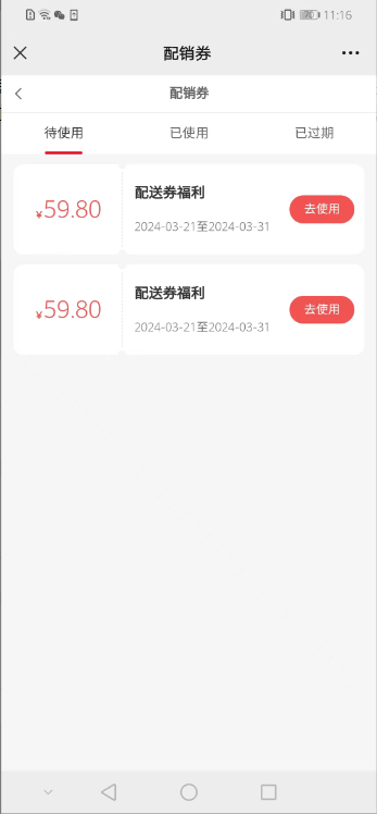 (二)进入显示所有配销券,当前列表的配销券每小时定时执行一次验证配销券是否过期,会员购买商品赠送了已过使用有效期的配销券,也需要过大概一个小时才会变为已过期。不影响下单,下单选择配销券时不能选择不在有效期范围内的配销券